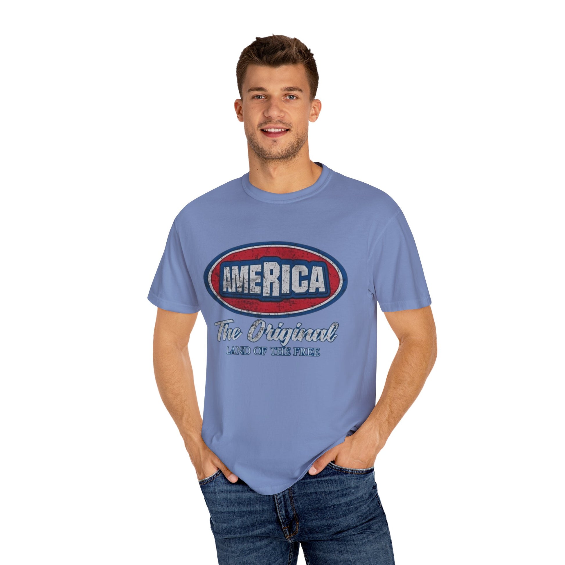 This USA patriotic Kingsford logo red, white, and blue Unisex Garment-Dyed T-shirt screams Americana vibes, perfect for celebrating Independence Day, Memorial Day, or any patriotic occasion. Made with high-quality, 100% ring-spun US cotton, this tee offers a relaxed fit for comfort in both casual and semi-formal settings. The double-needle stitching and garment-dyed fabric ensure durability and softness.