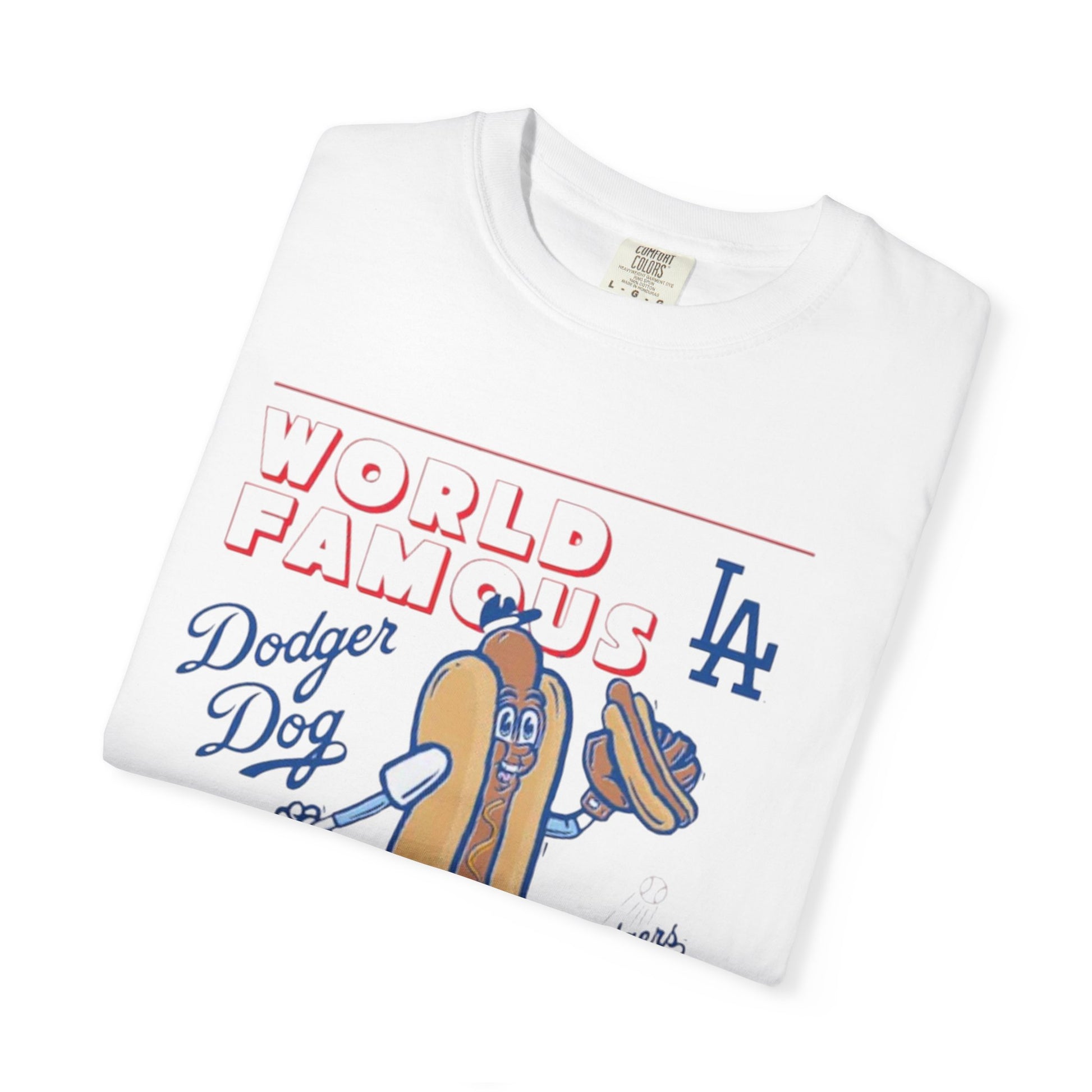 This World Famous “Dodger Dog” MLB Los Angeles Dodgers Hotdog Tee Unisex Garment-Dyed T-shirt exudes a fun and nostalgic vibe for baseball fans. Perfect for those who enjoy attending games or showing support for their favorite team. Ideal for MLB game days, sports events, casual outings, and as a gift for Dodger fans.