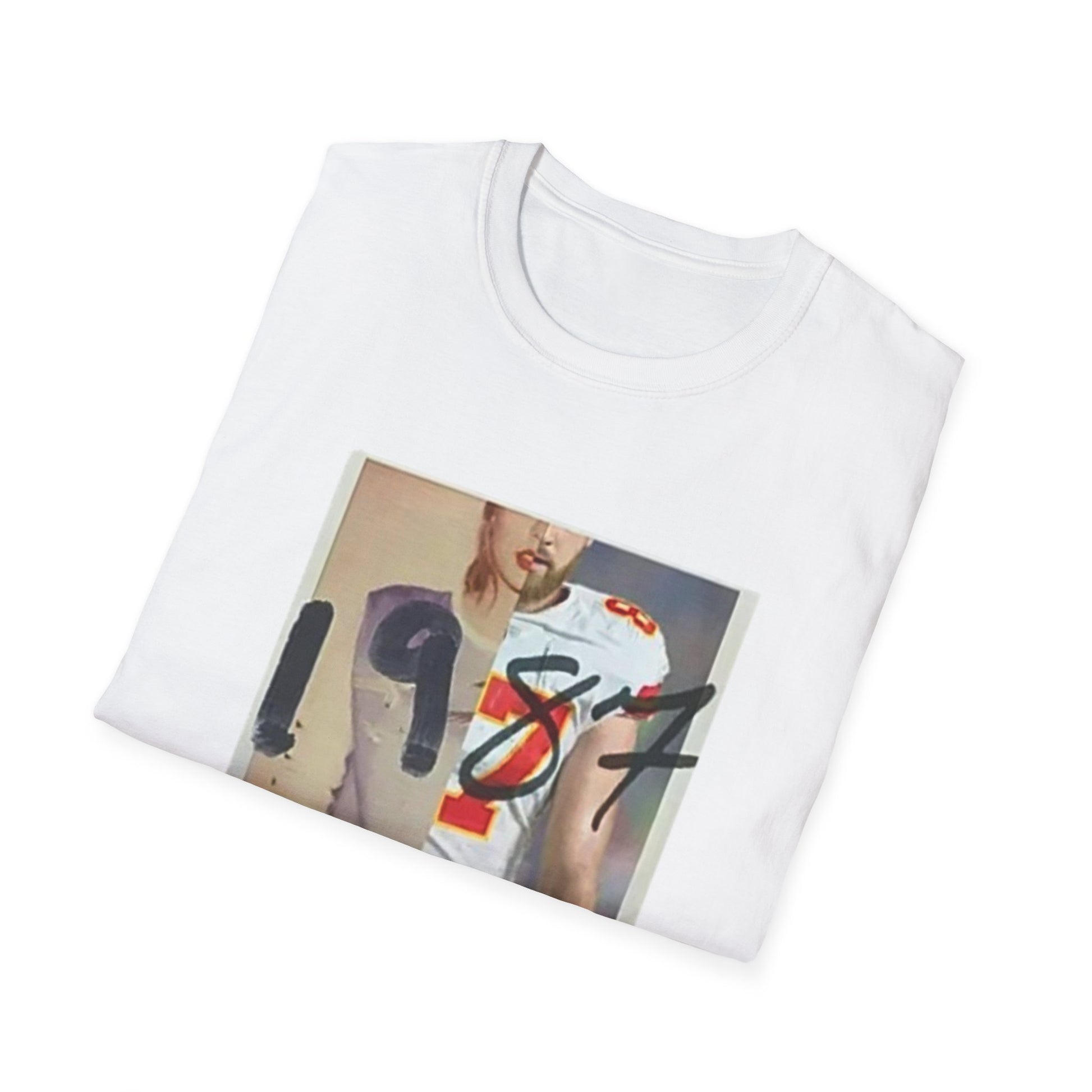 Show off the ultimate mashup of music and sports with this T Swift 1989 x Travis Kelce 87 unisex tee. Featuring a half 1989 album CD and half Kelce 87 jersey design, it celebrates the fun 19–87 love connection between pop culture and football. Perfect for Swifties, Chiefs fans, concerts, game days, or casual wear. Made with softstyle fabric for comfort and style, this shirt makes a thoughtful gift for fans who love both eras and touchdowns.