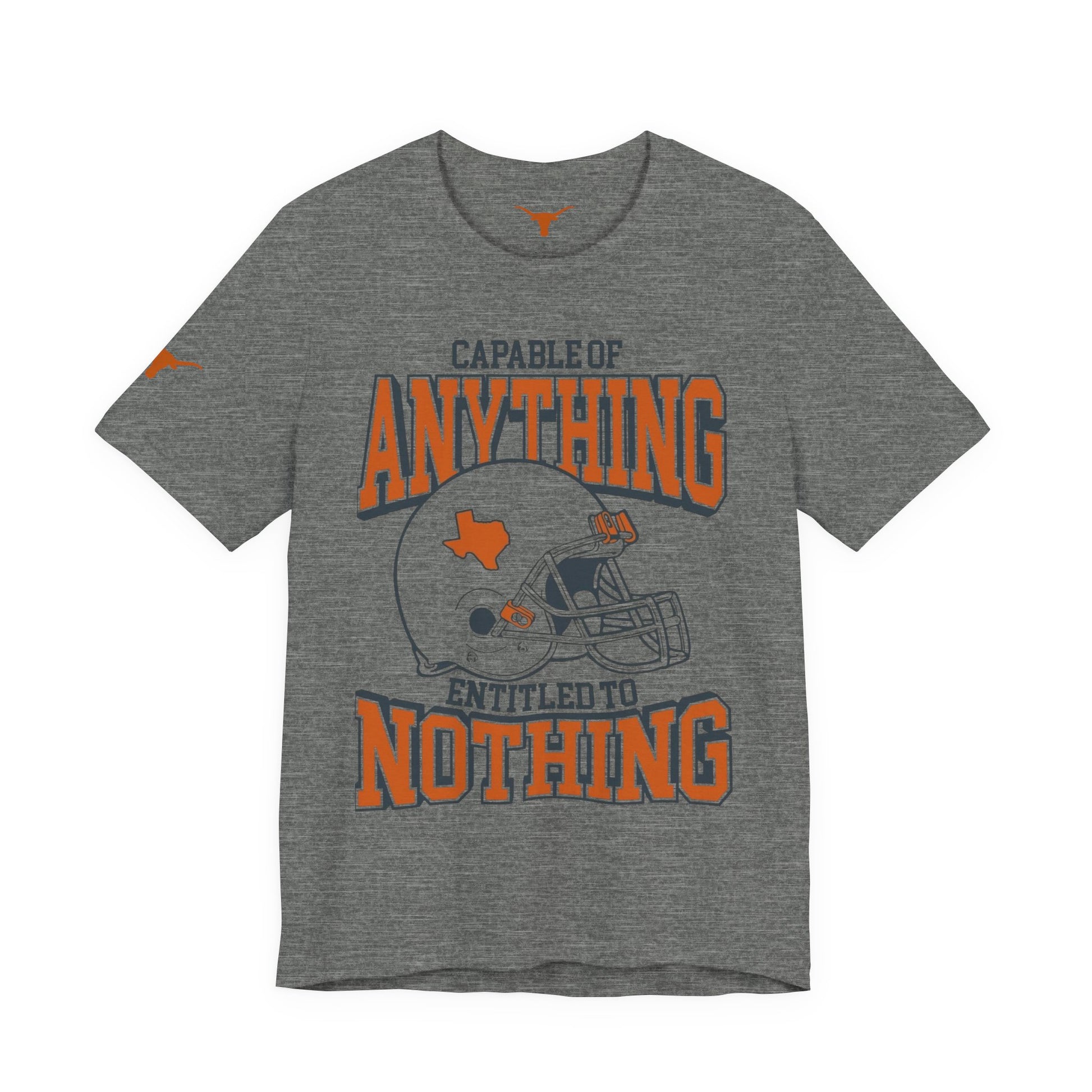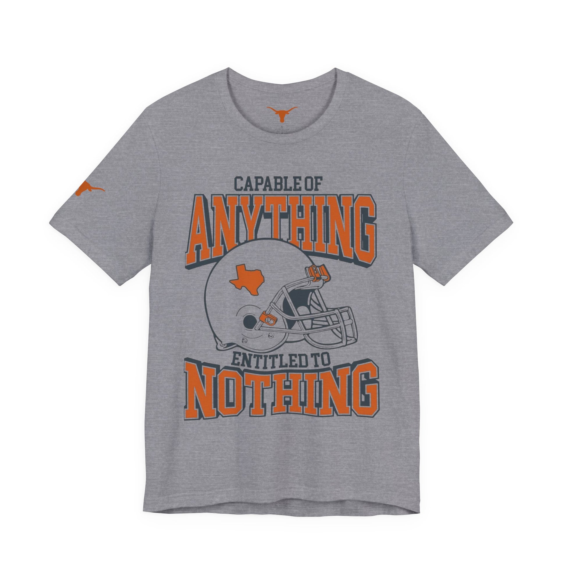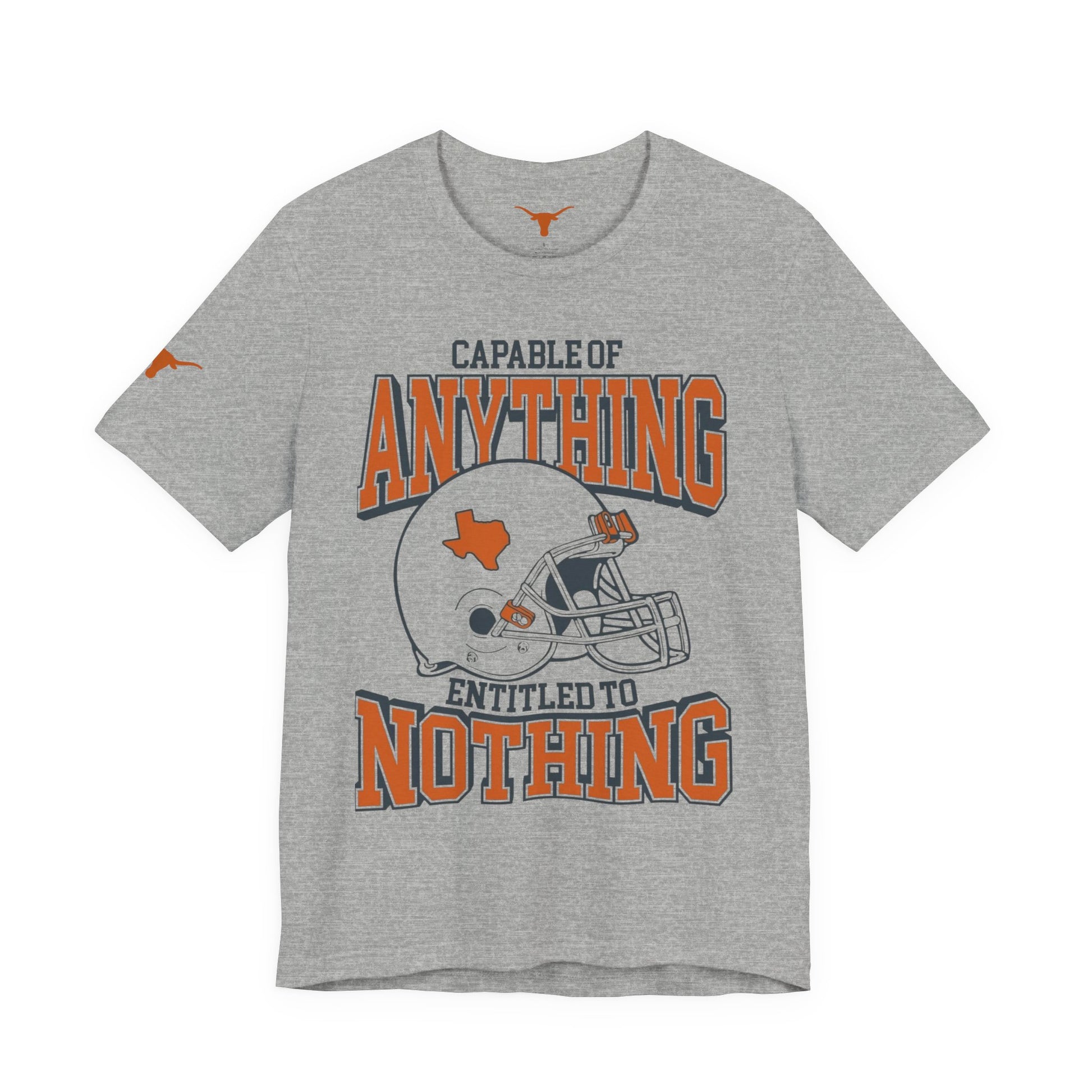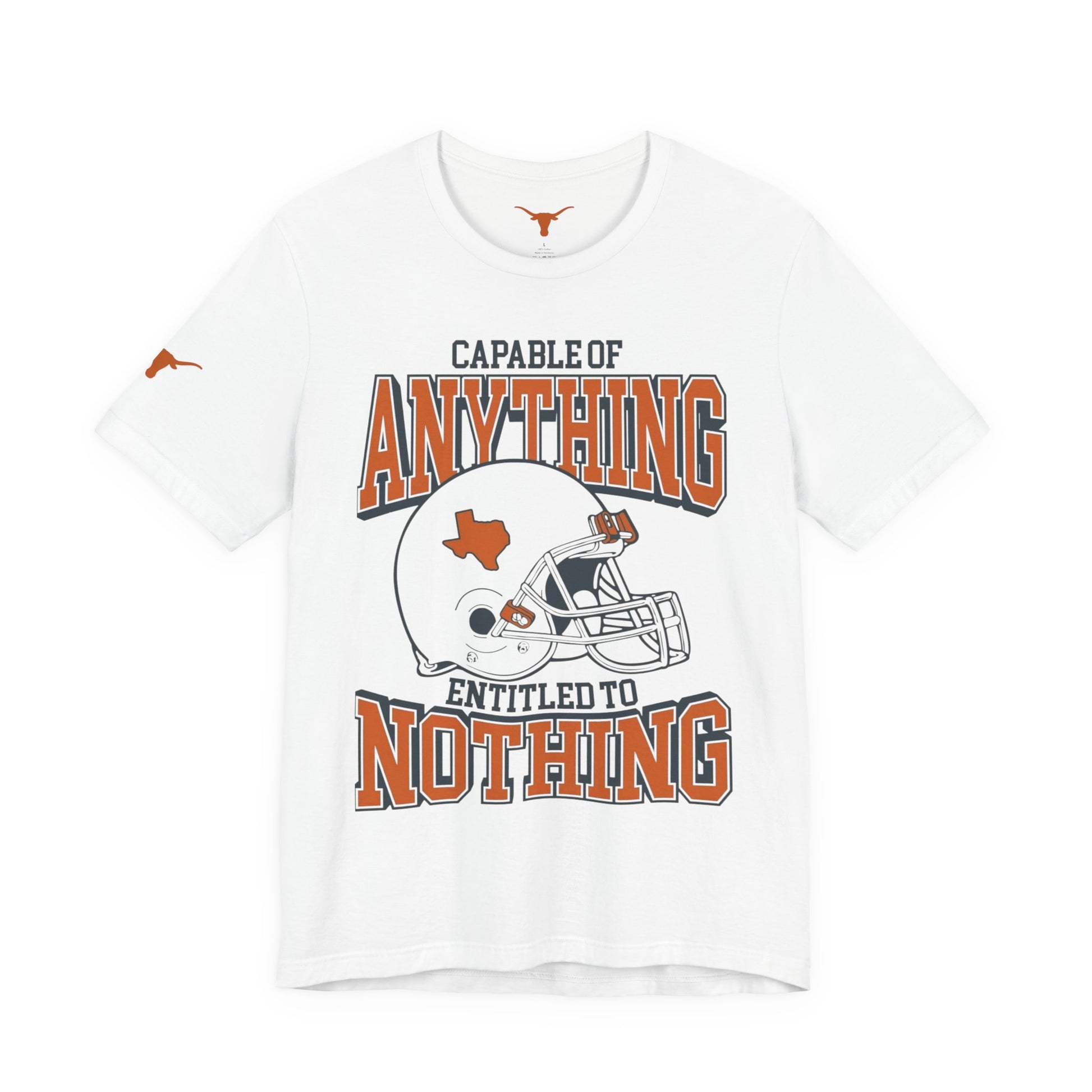 This Texas Longhorns “Capable of Anything, Entitled to nothing” College Football Inspiration Quote Football Helmet Tee exudes a sporty and motivational vibe, perfect for football fans and college students. It is ideal for game days, college events, and casual outings.