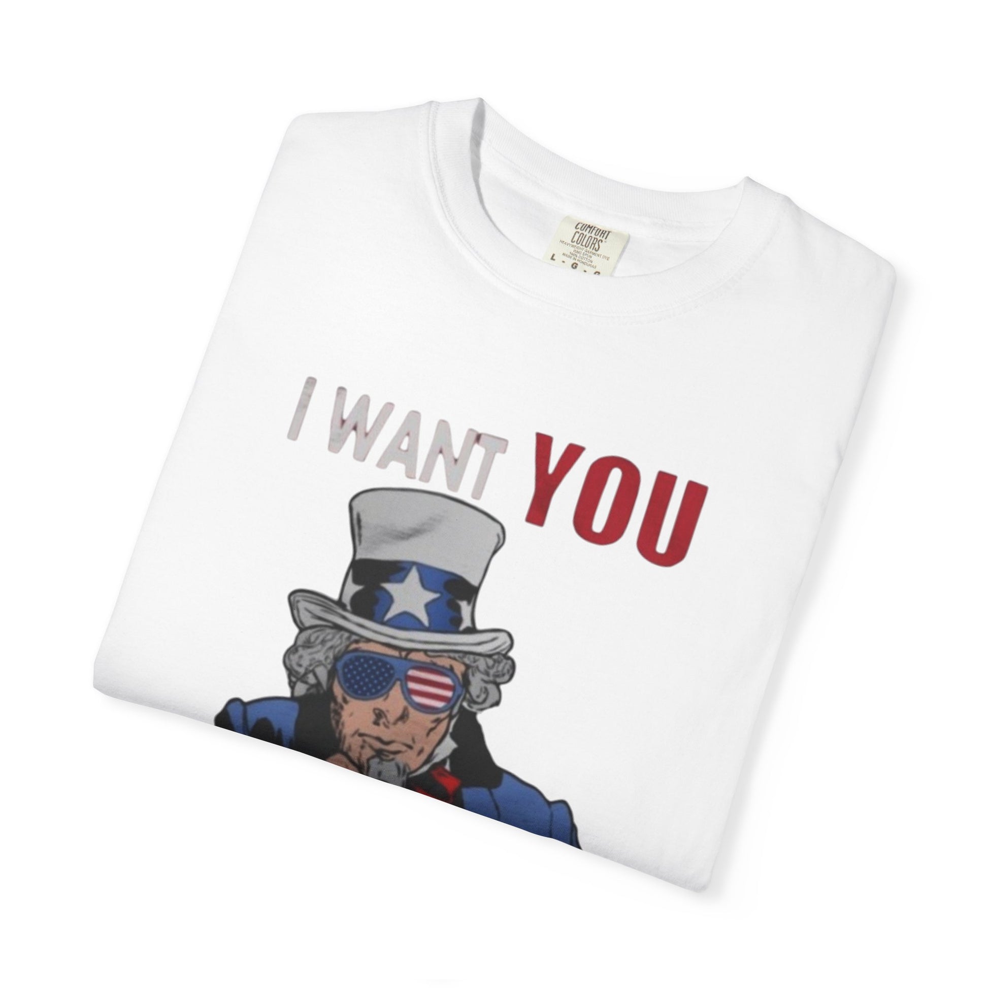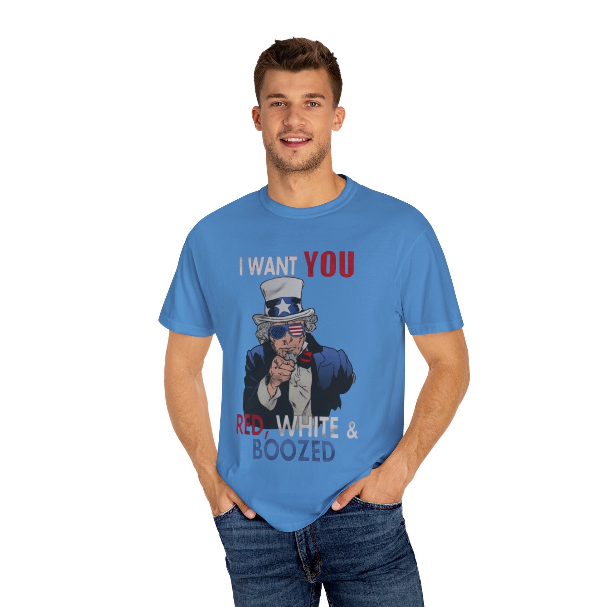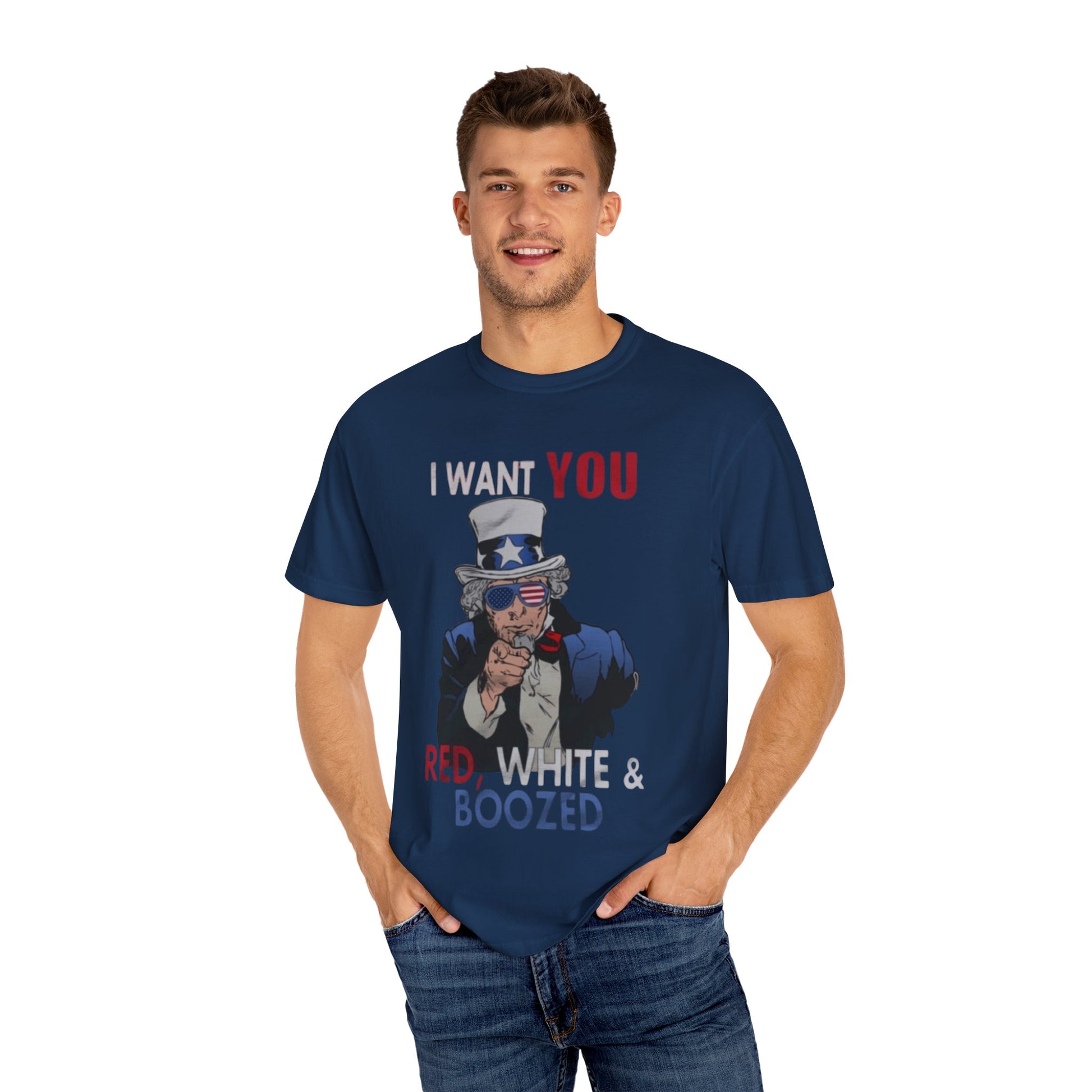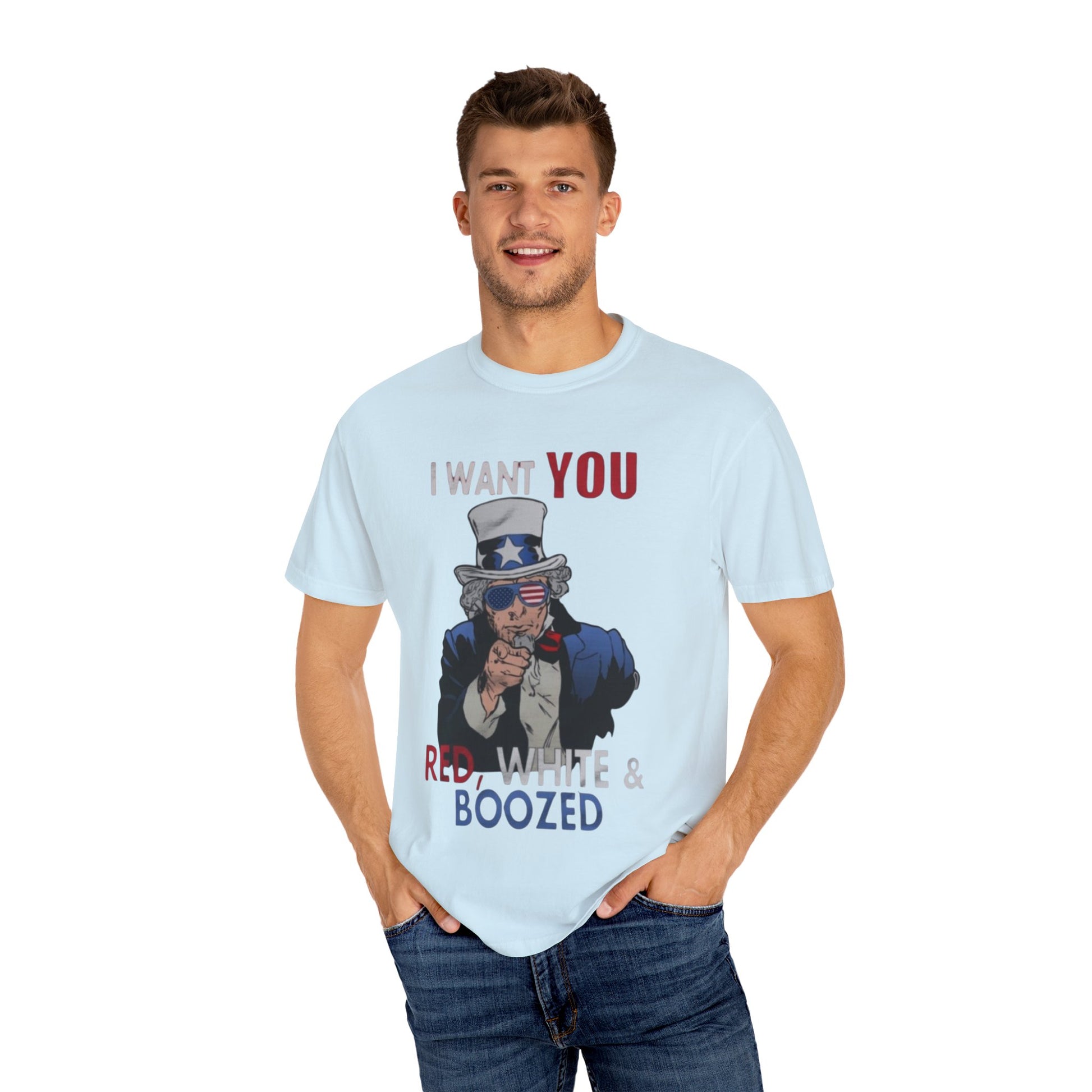 Celebrate in style with this patriotic Uncle Sam humor tee that says 'Uncle Sam I want you to be Red, White, and Boozed'. Perfect for summer, parties, the lake, Labor Day, 4th of July, or casual wear. The relaxed fit and medium fabric made of 100% US cotton ensure long-lasting comfort, making it a versatile and fun addition to any wardrobe. Relevant to adults looking to show their patriotism and love for summer celebrations.