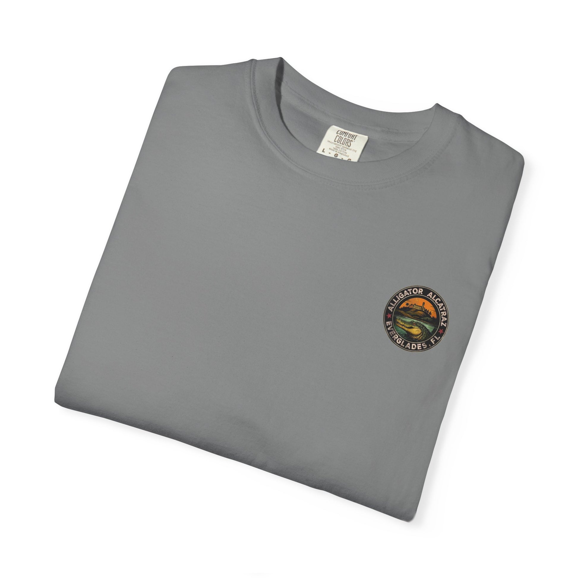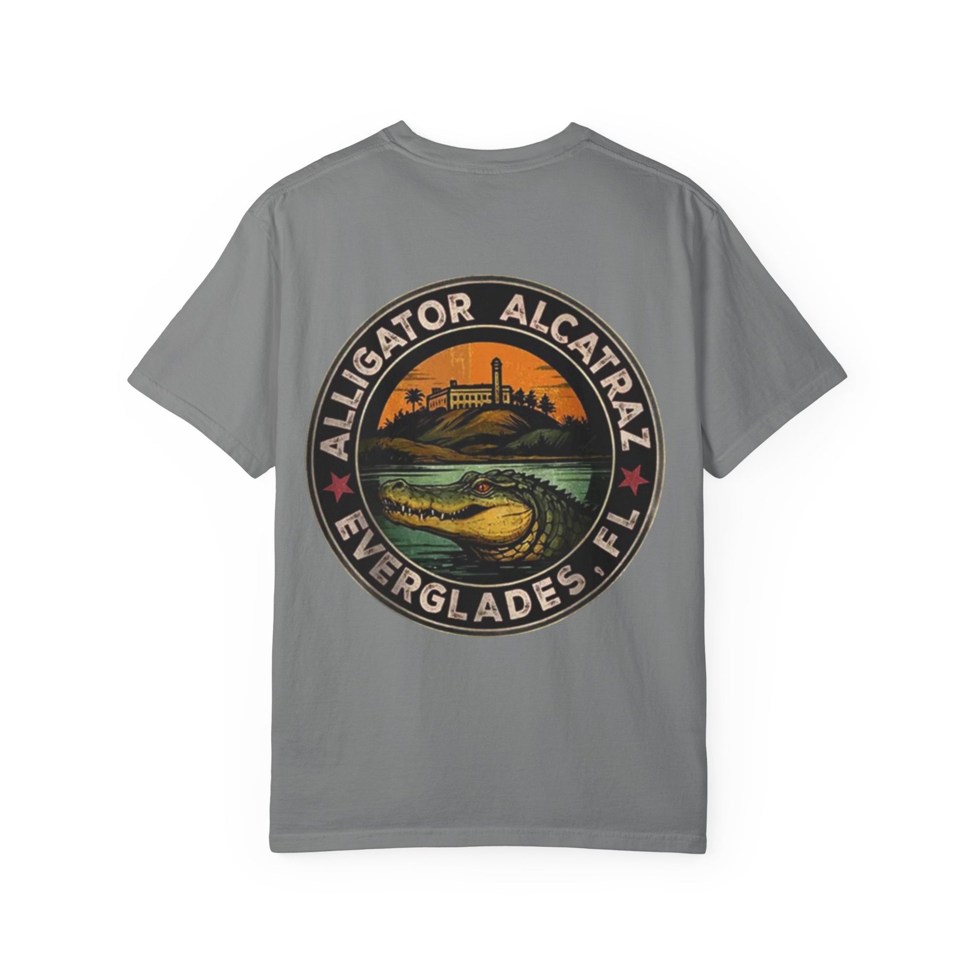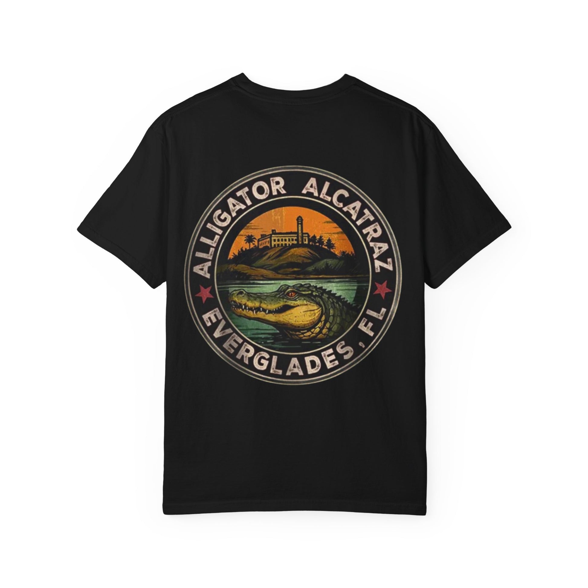 Feel patriotic and show your support with this unisex garment-dyed T-shirt featuring a USA MAGA Alligator Alcatraz 2025 Florida Everglades ICE Detention Facility design. Perfect for Trump supporters and those who love all things America. Ideal for Fourth of July celebrations, political rallies, or casual wear.